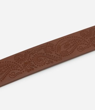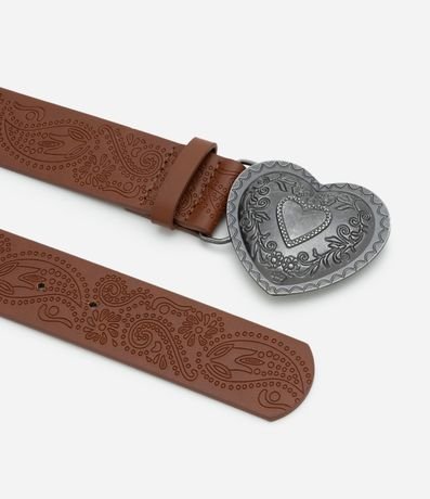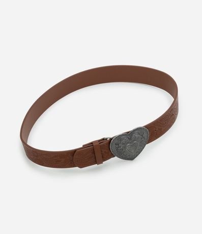 Ref: Cinto feminino médio em PU com faixa trabalhada em gravações de arabescos, fivela em formato de coração e acabamento envelhecido, criando contraste marcante com a tira.