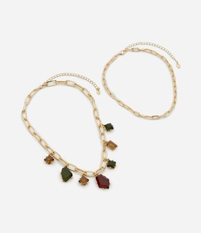 Ref: Colar feminino em camadas composto por duas correntes de elos metálicos. A camada principal traz pingentes geométricos em pedras e fecho alongado que permite ajuste de comprimento.