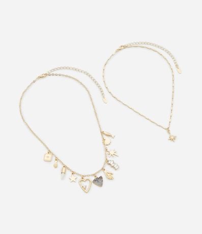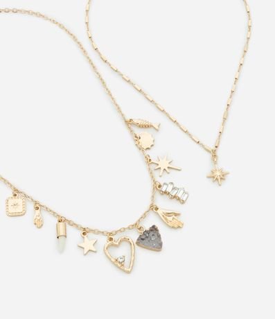 Colar camadas composto por colar com pingentes variados, entre eles, coração, estrela, strass e um colar com pingente de estrela.