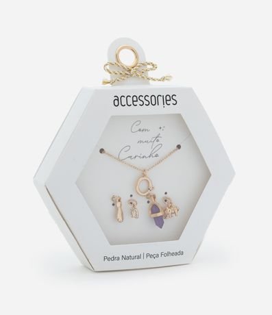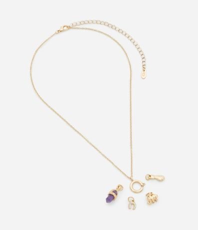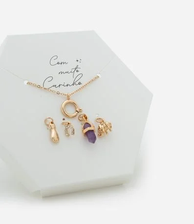 Ref: Colar curto feminino em metal reciclado com banho folheado, peça em seu diferencial com corrente fina e suporte para troca de pingentes, acompanha 04 pingentes diversos, sendo símbolos de sorte e embalagem para você presentear.