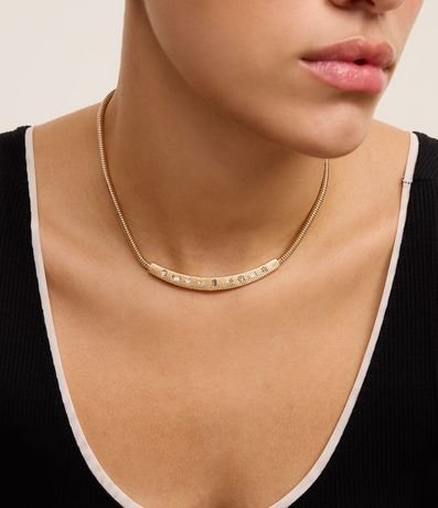 Ref: Colar curto confeccionado em metal reciclado com corrente rabo de rato, fechamento por lagosta, peça com placa de metal com strass de formas diferentes.