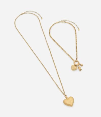 Colares femininos em 02 camadas confeccionados em metal. Possui 01 colar longo com pingente de coração e 01 colar curto com pingente de flor e coração.