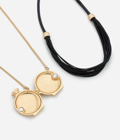 Colar feminino em camadas, composto por tiras de PU combinadas com corrente metálica. Acompanha pingente perfumeiro redondo com tampa, fixado à corrente longa.