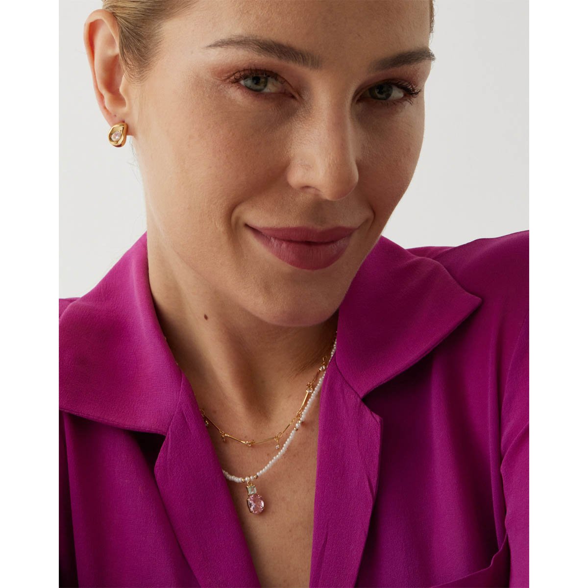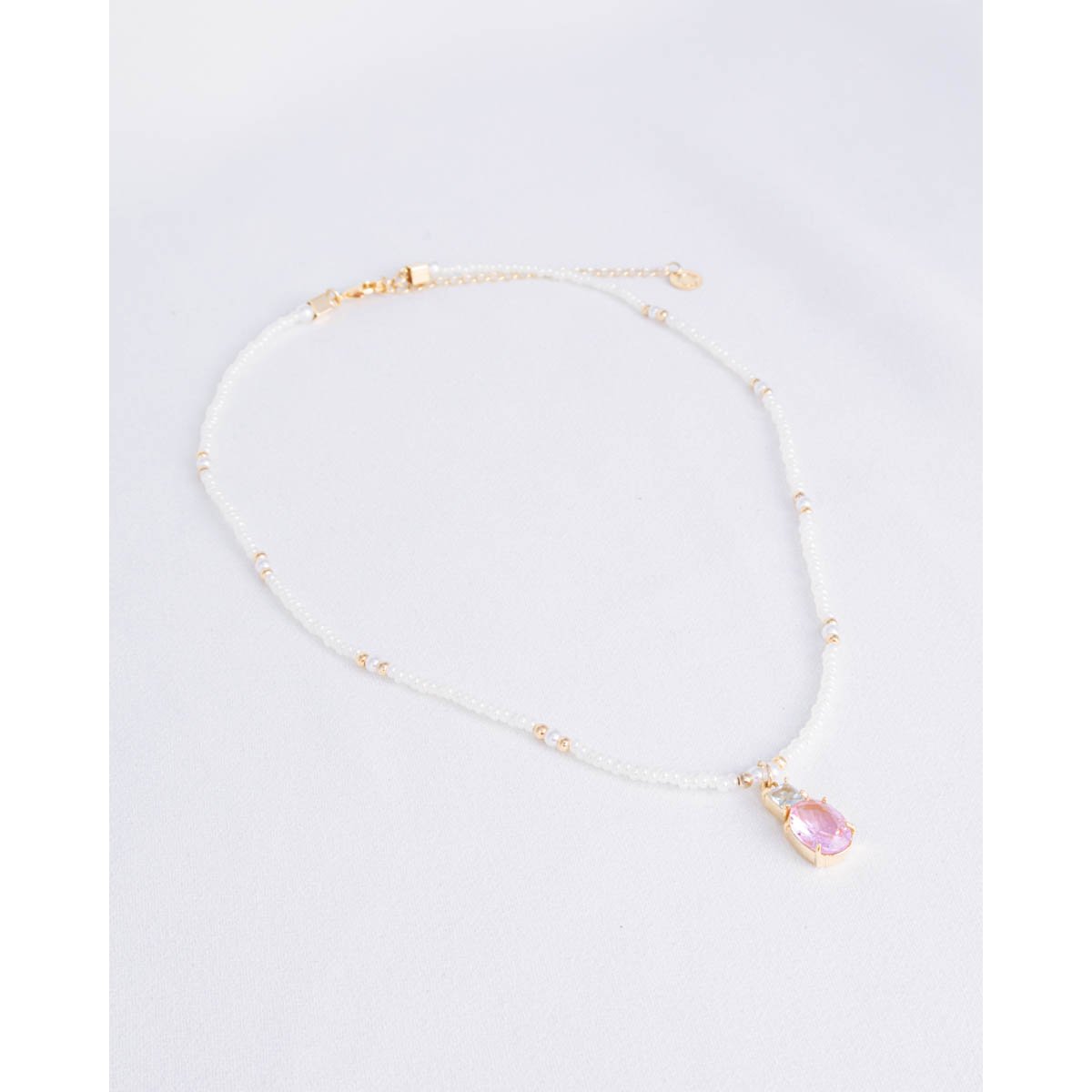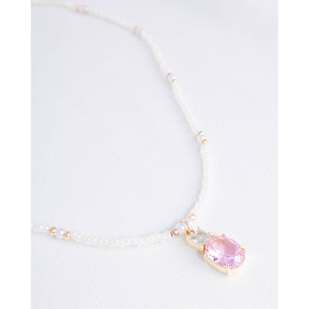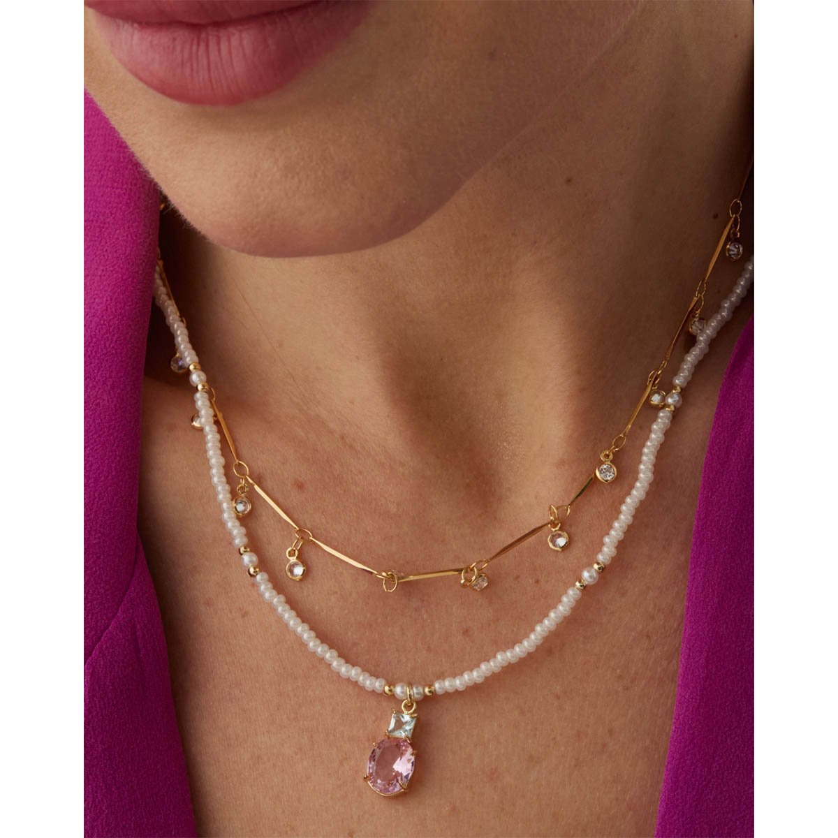 Colar Feminino Bead Perolado Dourado composto por pequenas pérolas em fio contínuo, intercaladas com detalhes dourados que acrescentam sofisticação. Ao centro, um pingente de vidro oval na tonalidade rosa suave, que transmite feminilidade e leveza. Uma peça versátil e elegante, perfeita para ocasiões especiais ou para dar um toque de charme a looks do dia a dia. Acabamentos e metais em banho dourado que levam 1,2 milésimo de ouro 18K em sua composição.
