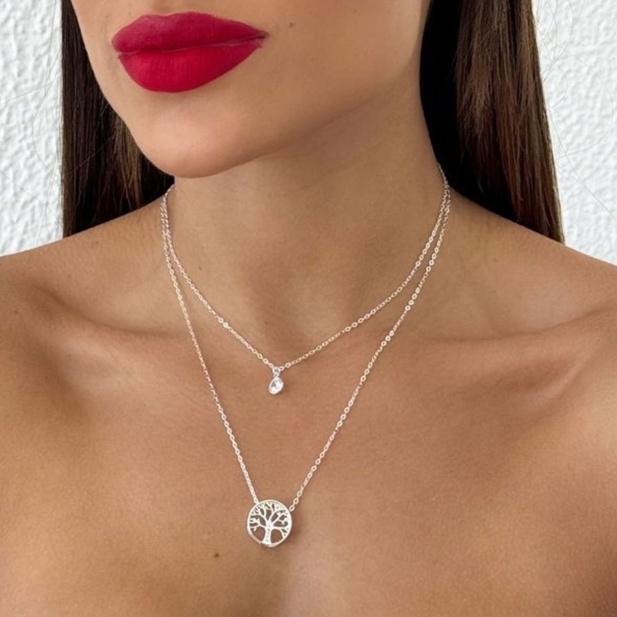 Colar Feminino Duplo Folheado a Prata Árvore da Vida e Ponto de Luz Prata
