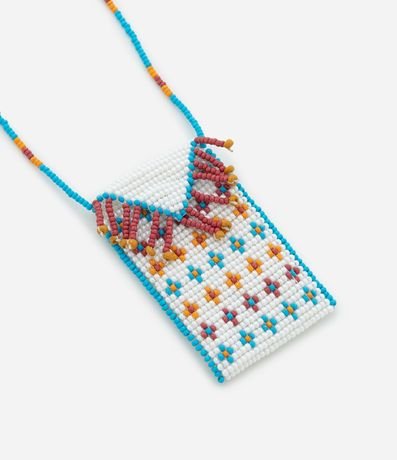 Colar longo de miçangas com pingente de bolsinha envelope com franjas. Peça com várias cores de miçangas.