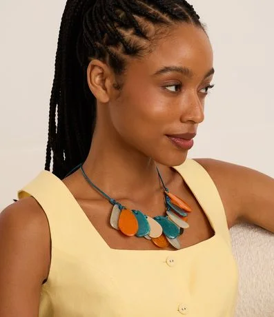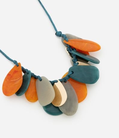 Ref: Colar maxi com cordão e amarrações, pedras em resina com formato orgânico e ponteiras em metal.