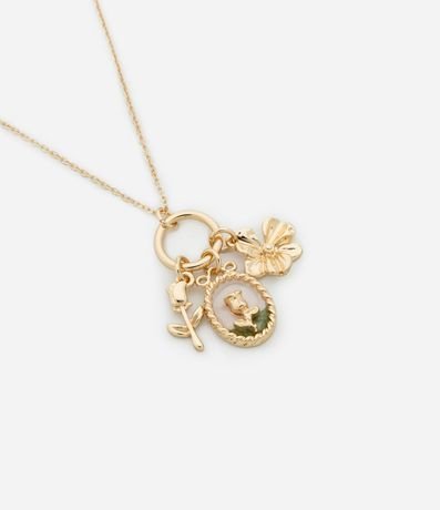 Ref: Colar longo confeccionado em metal reciclado com corrente fina e argola que une três pingentes fofos sendo duas flores e uma medalha com flor central em efeito esmaltado.