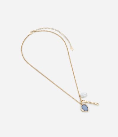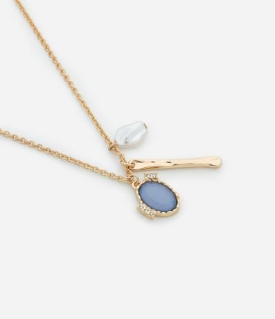 Ref: Colar médio com corrente delicada e um mix de pingentes que formam um espelho fofo, sendo uma pérola barroca artificial, um palito de metal e uma resina arredondada com strass.