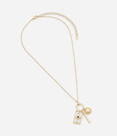 Ref: Colar feminino médio, confeccionado em metal reciclado, peça com argola que une pingentes diversos como madrepérola artificial com estrela, palito e meia esfera.
