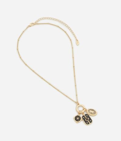 Ref: Colar médio confeccionado em metal reciclado. O acessório tem corrente com mini esferas e três pingentes esmaltados unidos por uma argolinha.
