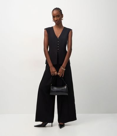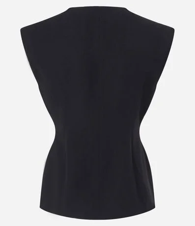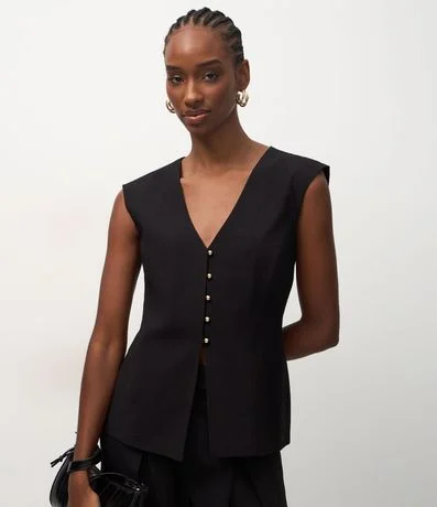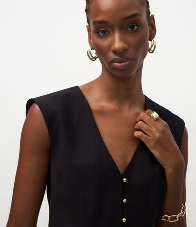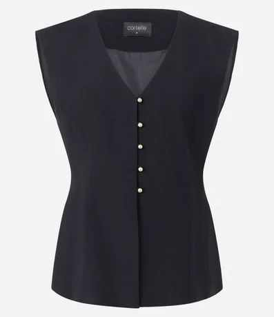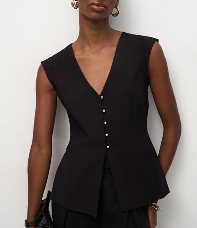 Ref: Colete feminino alfaiatado em poliéster confeccionado com viscose mais sustentável. Possui modelagem acinturada com decote em v, sem mangas, mini botõezinhos delicados na parte frontal.