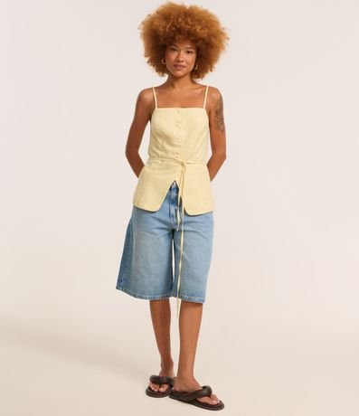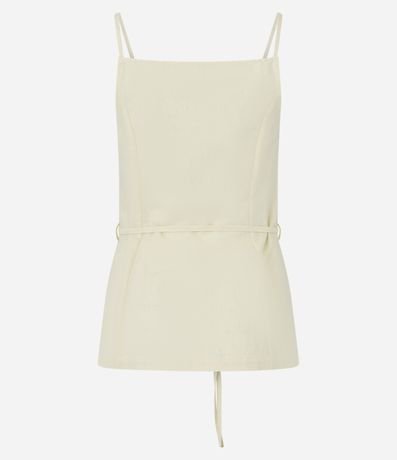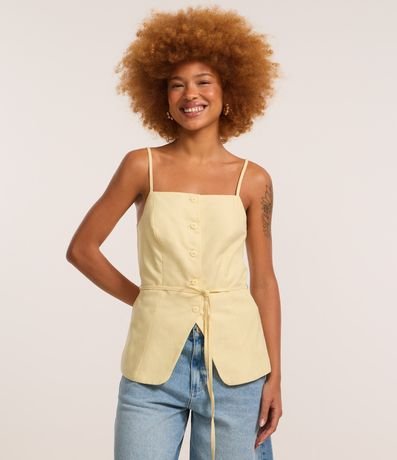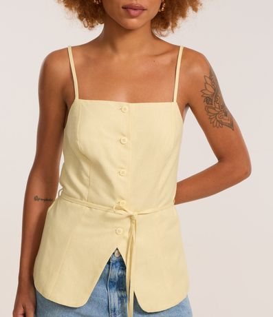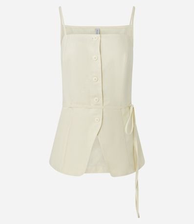 Ref: Colete sem mangas, confeccionado em algodão com 15% de linho, com decote reto, com detalhe acinturado e amarração na cintura.