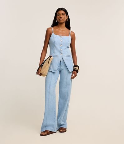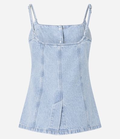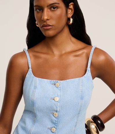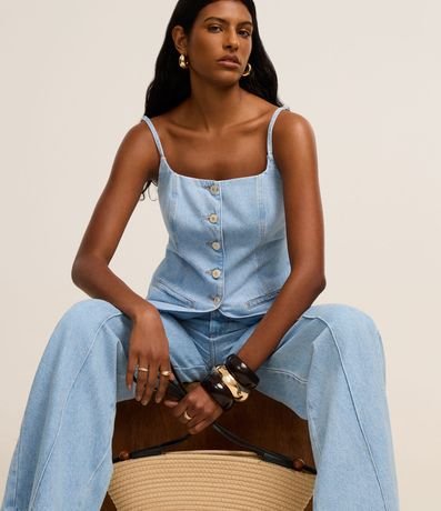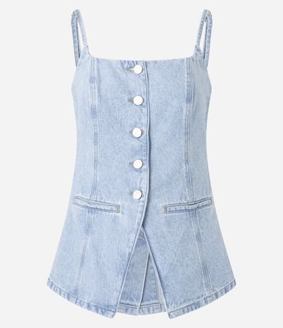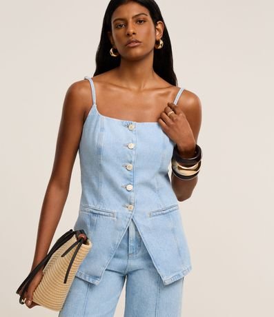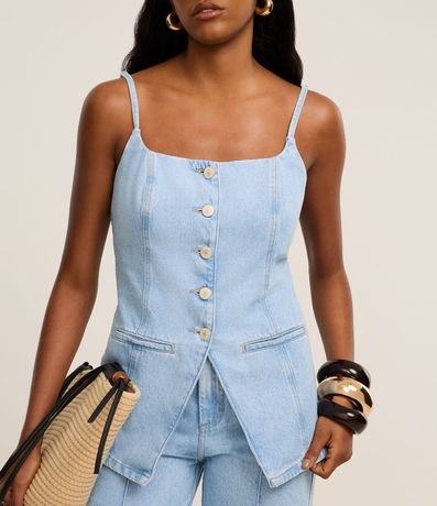 Ref: Colete longo de alcinhas finas reguláveis, confeccionado em jeans, com decote reto, botões frontais, pences, bolsos frontais falsos e barra V. Este produto possui algodão certificado BCI em sua composição, sendo ambientalmente mais responsável.