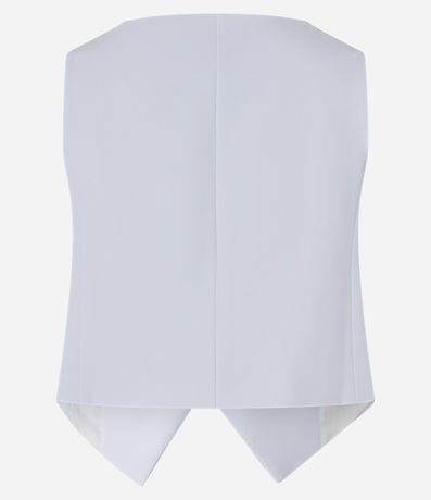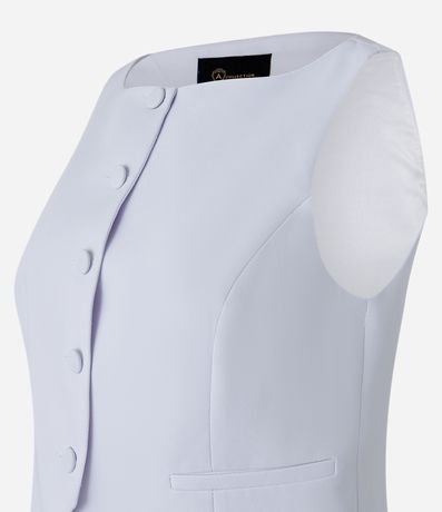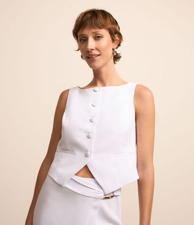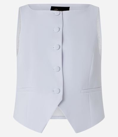 Ref: Colete com corte alfaiatado com decote canoa, botões frontais forrados para fechamento além de barra com recorte V.