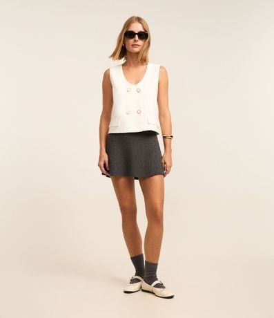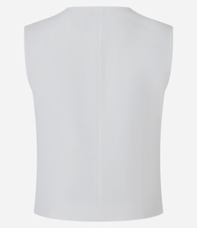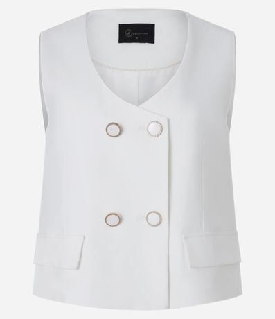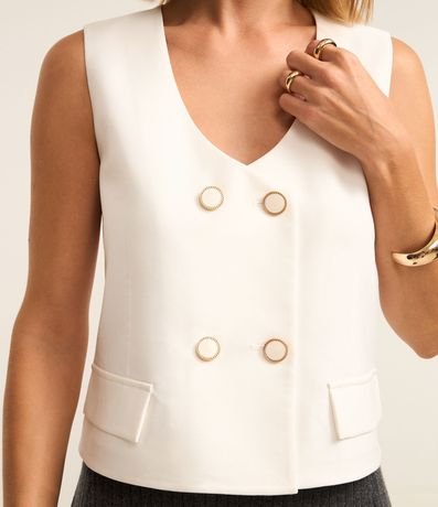 Colete de estrutura alfaiatada com decote V, botões frontais com transpasse e lapelas aplicadas que simulam bolsos.