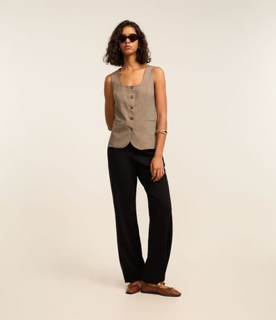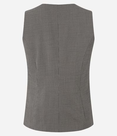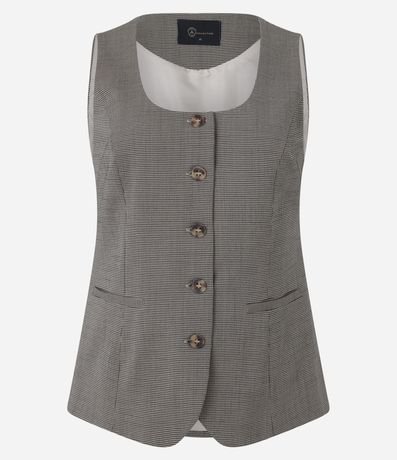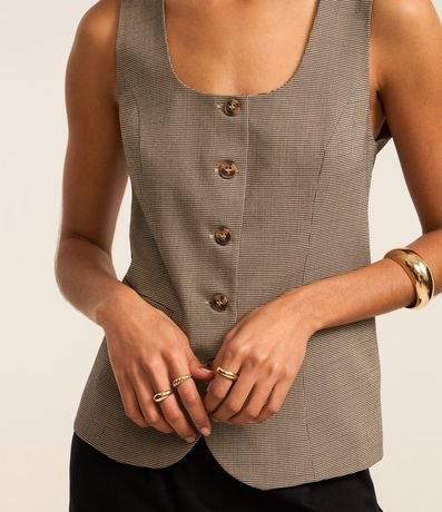 Ref: Colete de estrutura alfaiatada com decote quadrado, abotoamento frontal e recortes frontais que simulam bolsos. Peça tem estamparia pied de poule, que é um estilo de estampa ou padronagem xadrez diferenciada.