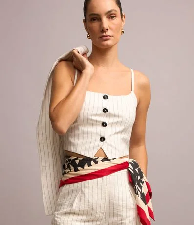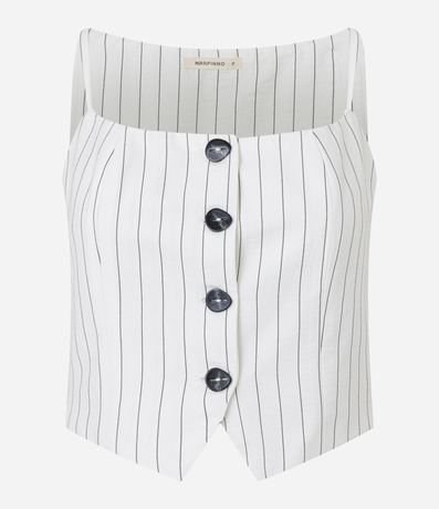 Colete de estrutura alfaiatada confeccionado em viscose com decote quadrado, botões frontais para fechemamento, detalhe V na barra e listras verticais.