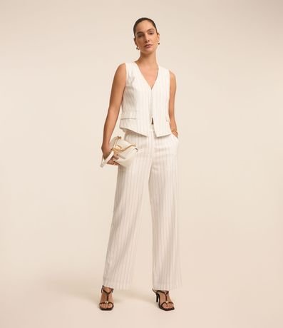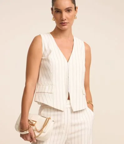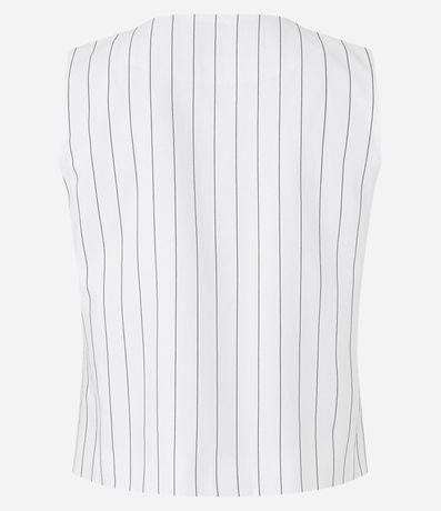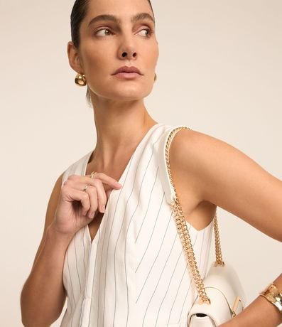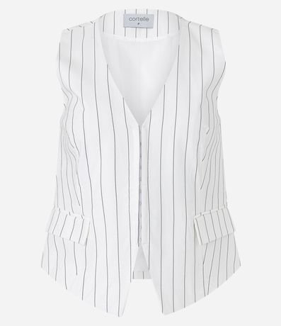 Ref: Colete alfaiatado com fechamento diferenciado, bolsos frontais com lapelas e listras verticais em estilo riscas de giz.