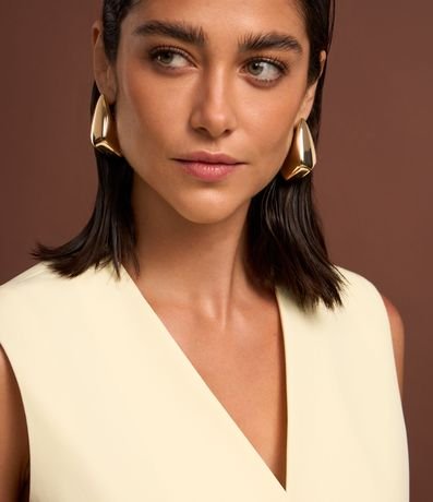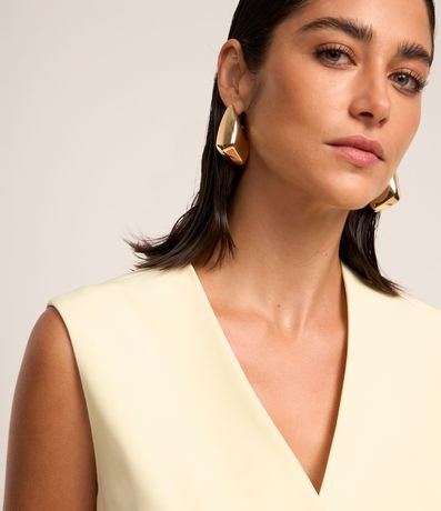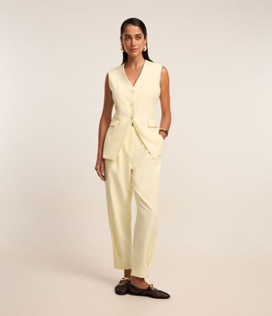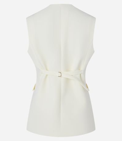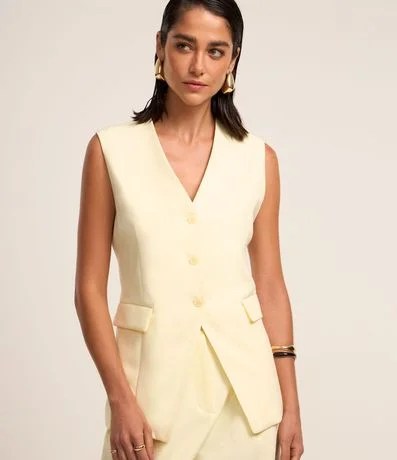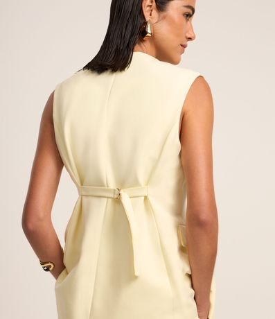 Ref: Colete feminino de alfaiataria alongado com bolsos frontais e detalhe em v na barra