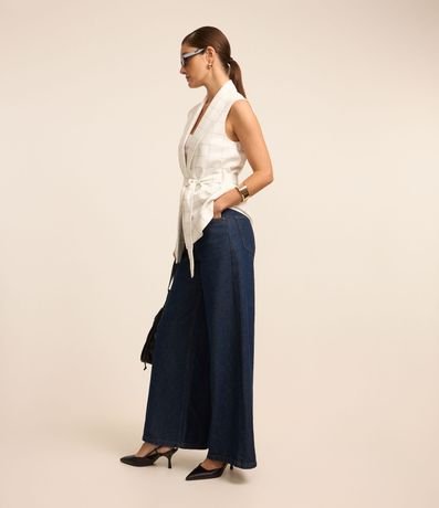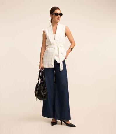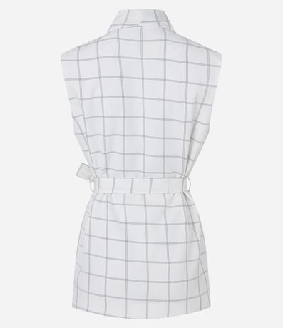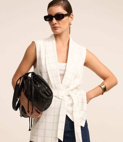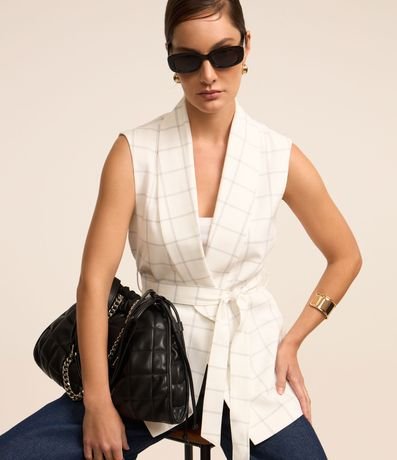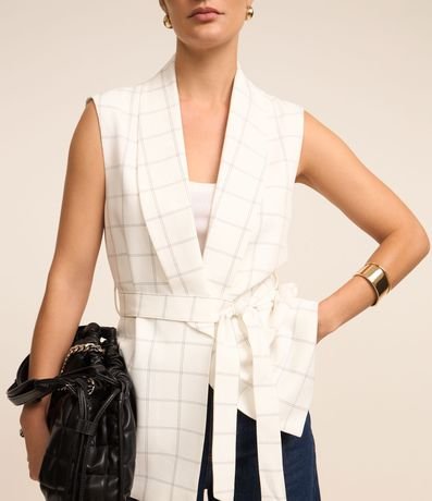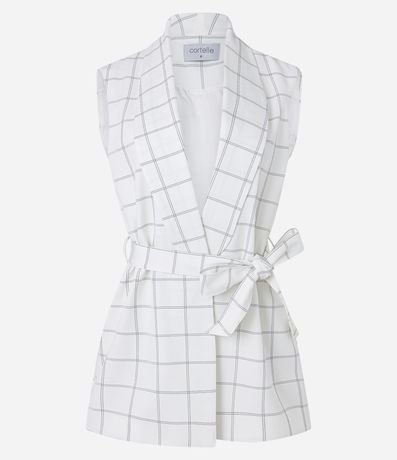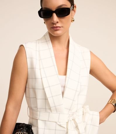 Ref: Colete alongado alfaiatado com lapelas na gola, passantes e amarração na cintura além de estamparia xadrez grid.