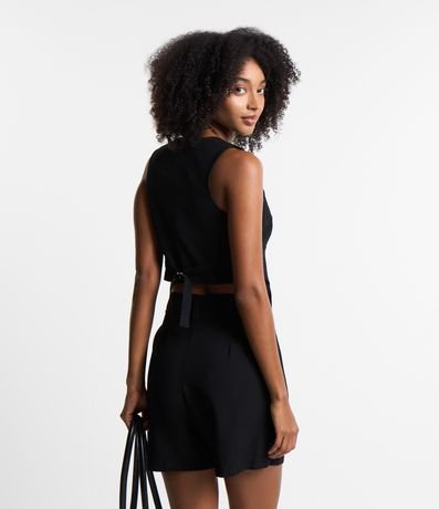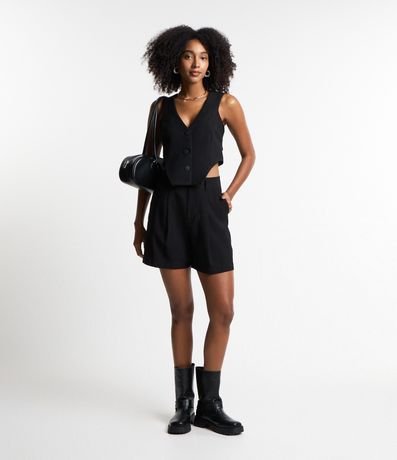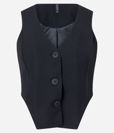 Ref: Colete em alfaiataria, três botões frontais, decote v, passantes e fivelinha em metal nas costas.