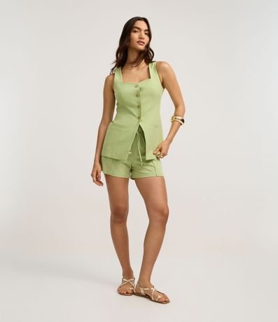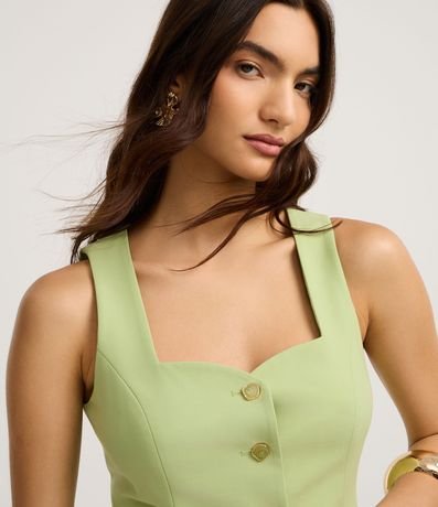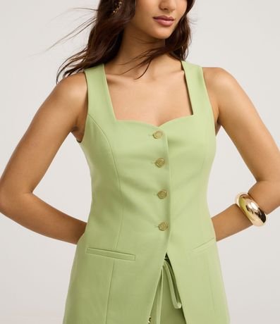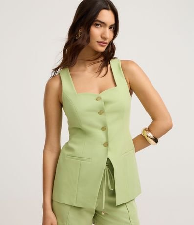 Ref: Colete alfaiatada, confeccionada em viscose, com decote quadrado com detalhe de decote coração, abotoamento frontal, pences frontais, bolsos falsos e barra V. Este produto possui viscose certificada em sua composição, sendo ambientalmente mais responsável.