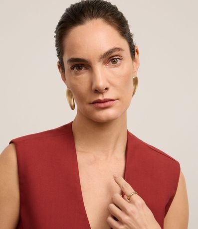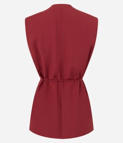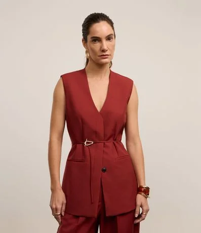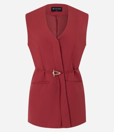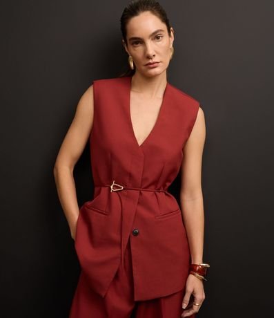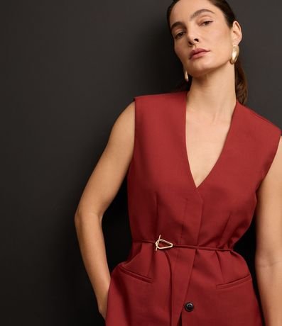 Ref: Colete feminino de modelo alongado, com corte alfaiatado. Possui gola V, detalhes de costuras, bolsos, abertura frontal com fechamento por cordão com fivela metalizada. Item confeccionado com material e processo mais sustentáveis.