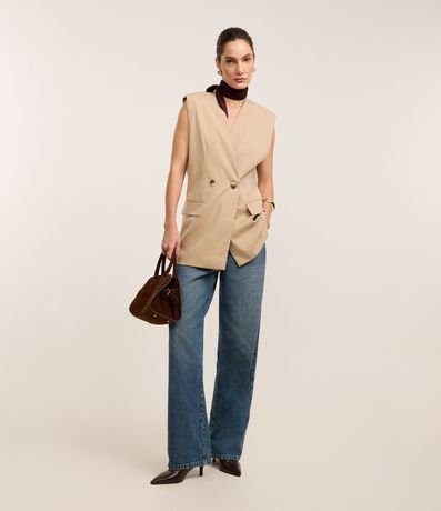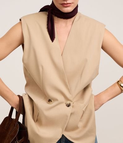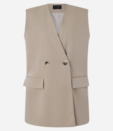 Ref: Colete alongado em alfaiataria, decote v transpassado, fechamento por dois botões frontais e lapelas.