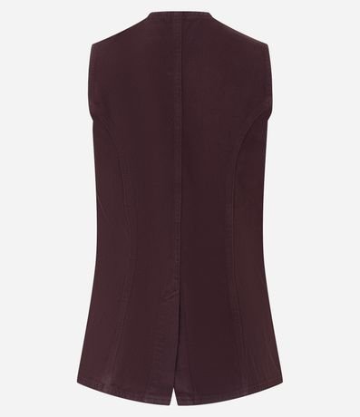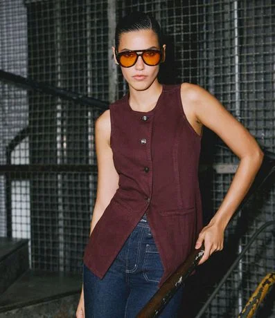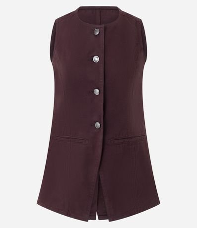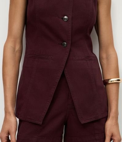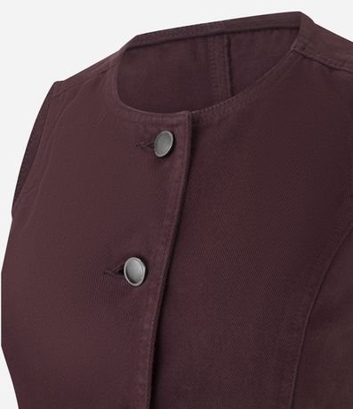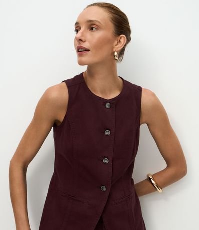 Ref: Colete feminino confeccionado em sarja de algodão certificado bci, modelo alongado com gola redonda, abotoamento contrastante, detalhes de recortes, bolso faca, e cintura ajustada.