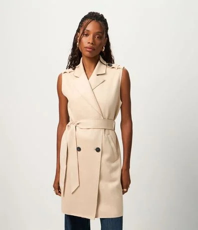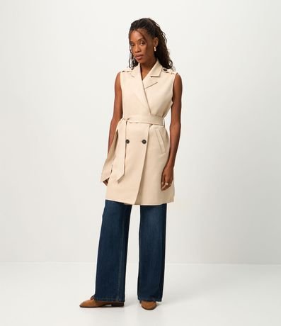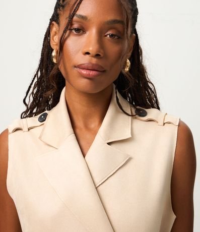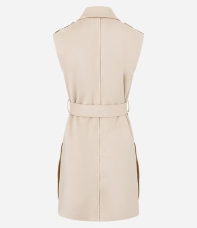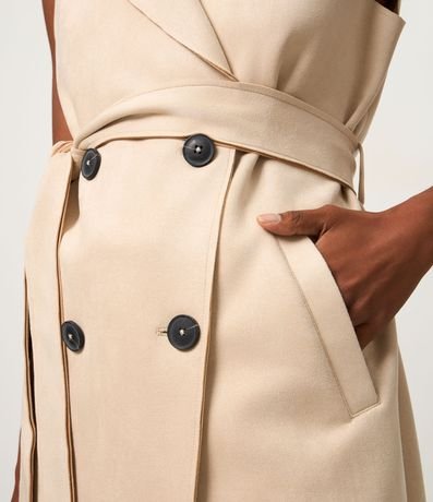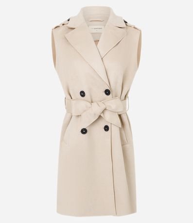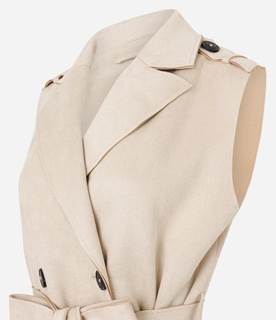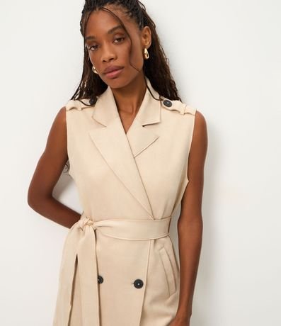 Ref: Colete feminino alongado em suede, com abotoamento frontal, lapelas estruturadas, faixa para amarração na cintura e acabamento macio, oferecendo estrutura leve e versátil para compor diferentes looks.