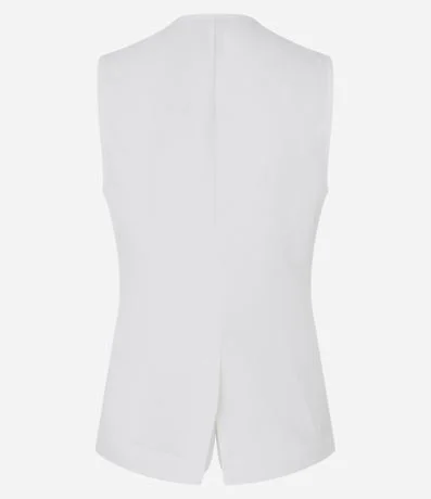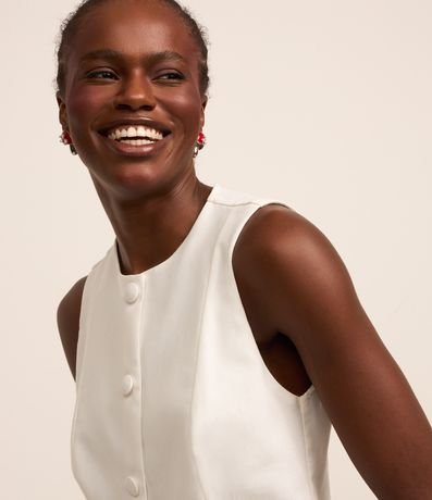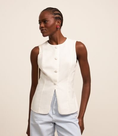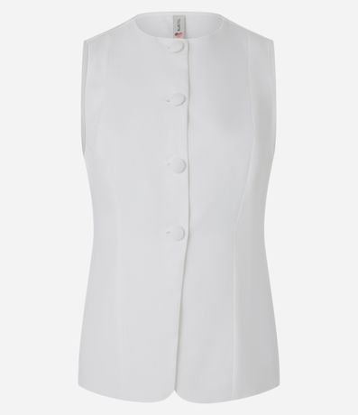 Ref: Colete feminino confeccionado com mix de tecidos, gola redonda e fechamento por botões revestidos.