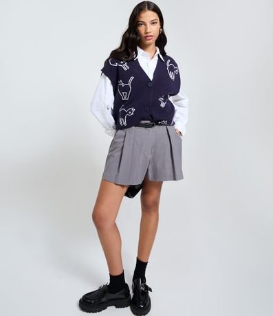 Ref: Colete feminino confeccionado em jacquard, com modelagem sem mangas e fechamento frontal por botões. Possui estampa de gatos em contraste, trazendo um toque divertido e moderno ao visual. Ideal para sobreposições estilosas, confeccionado com boas práticas ambientais e viscose certificada.
