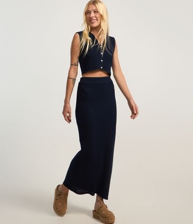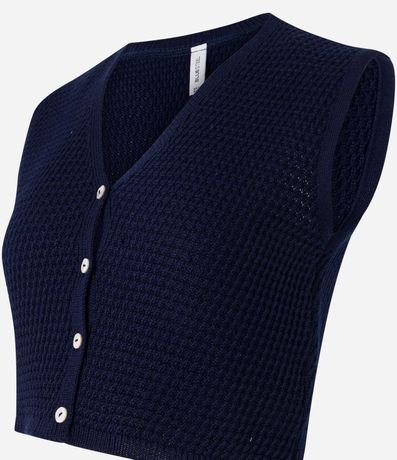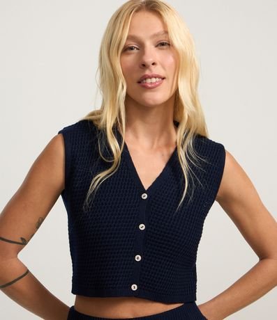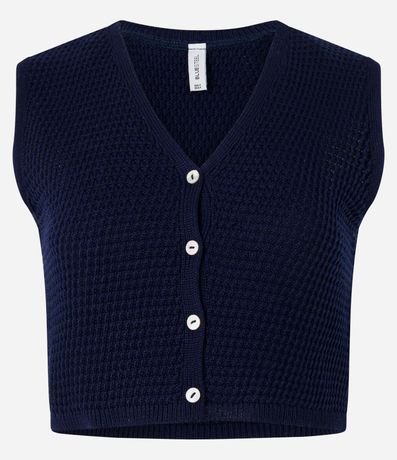 Ref: Colete cropped confeccionado em tricô leve produzido em boas práticas ambientais, botões frontais e ponto diferenciado.