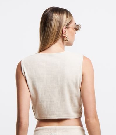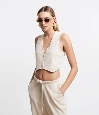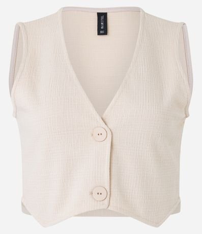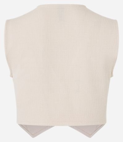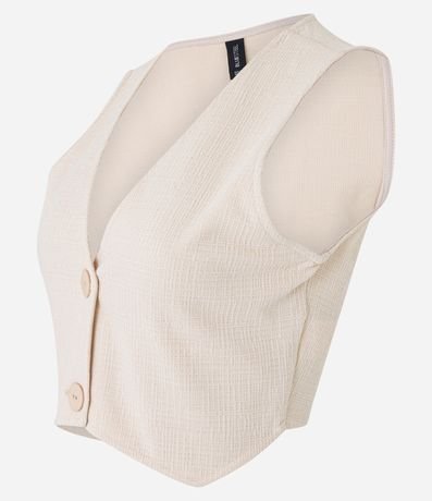 Ref: Colete cropped, decote v, dois botões frontais e barra assimétrica em v na parte da frente.