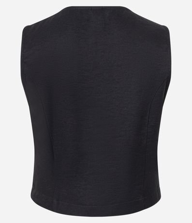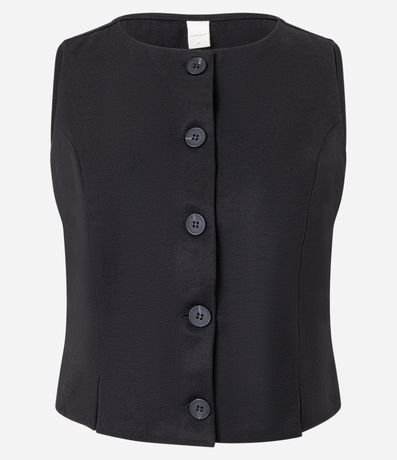 Ref: Colete feminino curto com corte alfaiatado, gola redonda, abotoamento frontal com detalhe de fendas. Produto confeccionado em viscose certificada com boas práticas ambientais.