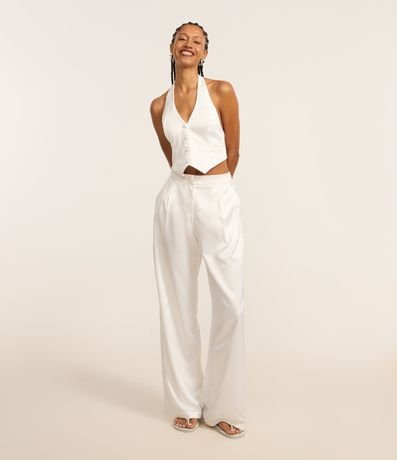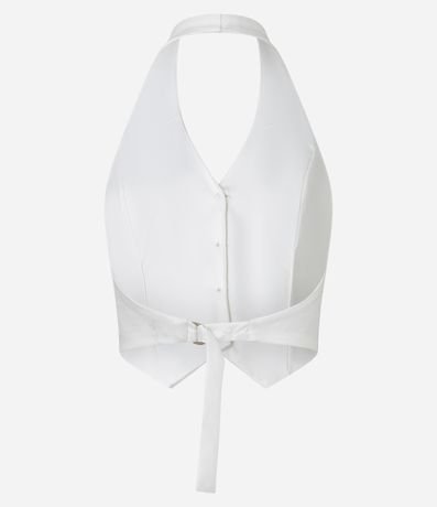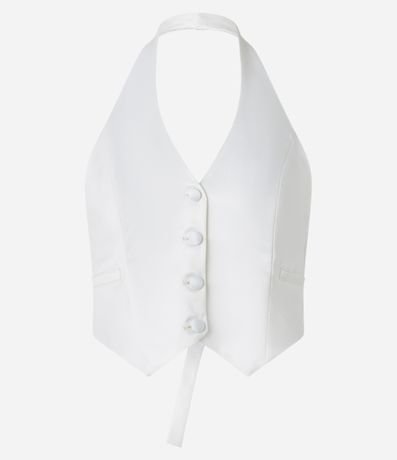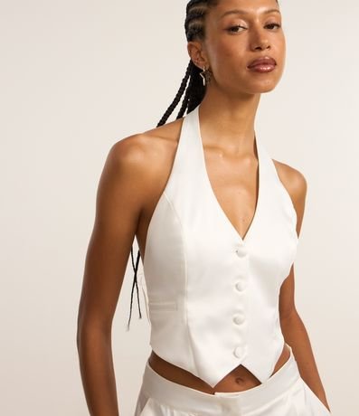Colete feminina em cetim com frente única, abotoamento frontal e tira afivelada nas costas.