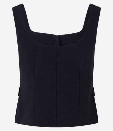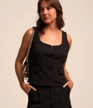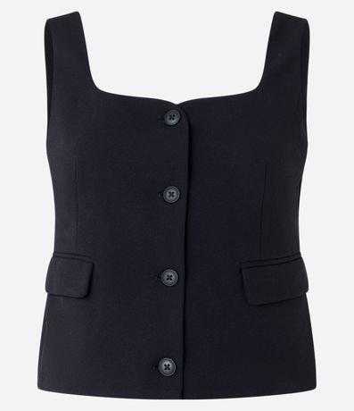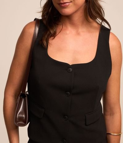 Ref: Colete confeccionado em crepe com decote quadrado no busto e nas costas, botões frontais para fechamento e lapelas frontais que simulam bolsos.
