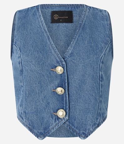 Ref: Colete regular confeccionado em jeans com algodão bci, abotoamento frontal com recortes e barra em V.
