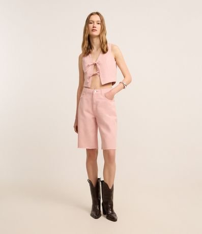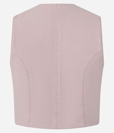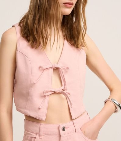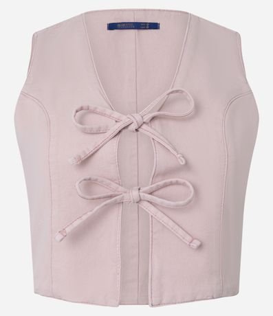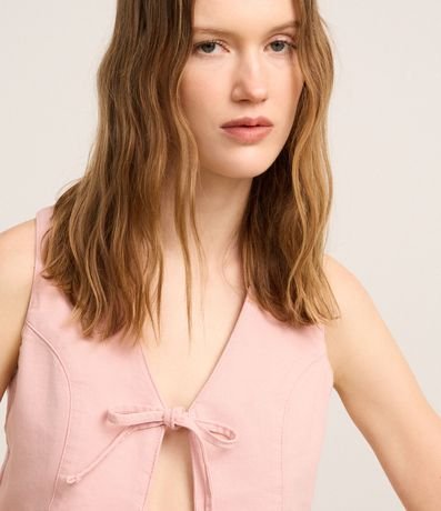Ref: Colete feminino em sarja confeccionada em algodão certificada bci com boas práticas ambientais, decote em v com amarração frontal e recortes.