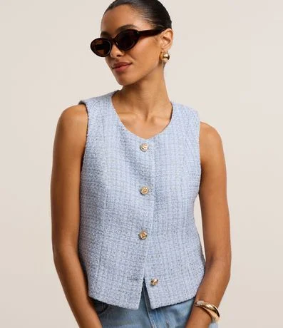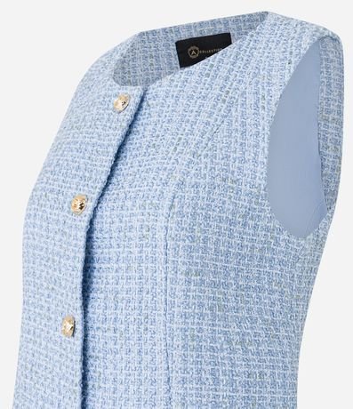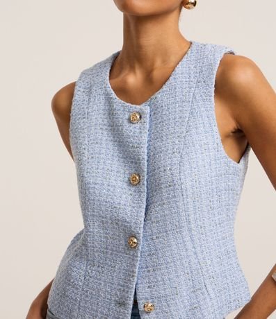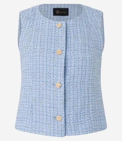 Colete confeccionado em tweed com gola redonda e abotoamento frontal. A peça tem botões metalizado com textura de efeito torcido.
