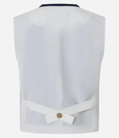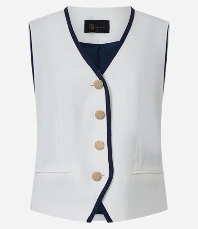Ref: Colete em viscolinho com decote V, botões frontais para fechamento, gola e vista com contraste, botões frontais e bolsos falsos frontais. Peça tem faixa com botão nas costas.