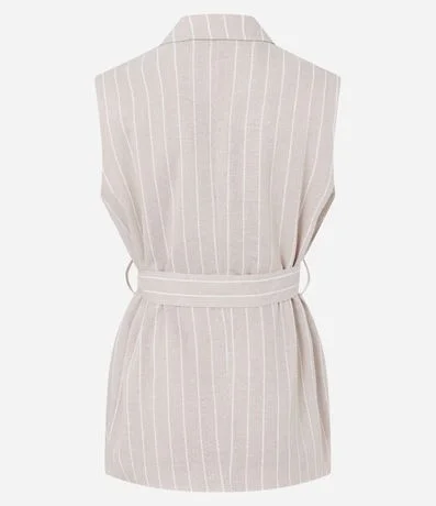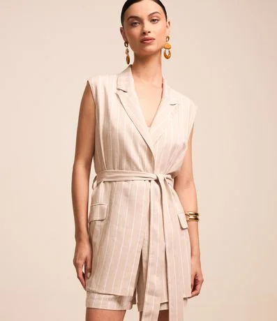 Ref: Colete confeccionado em viscolinho com gola blazer com lapelas, amarração na cintura, lapelas frontais e listras verticais. Possui listras com fios tintos.