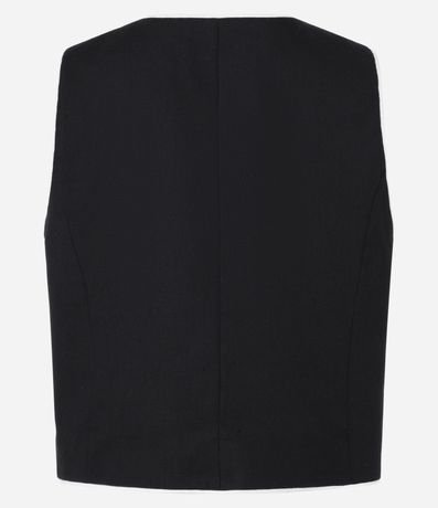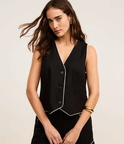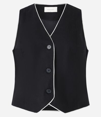 Colete confeccionado com viscose mais sustentável e linho. Roupa tem barras pontiagudas e vieses contrastantes nas extremidades.