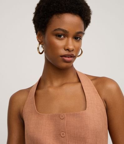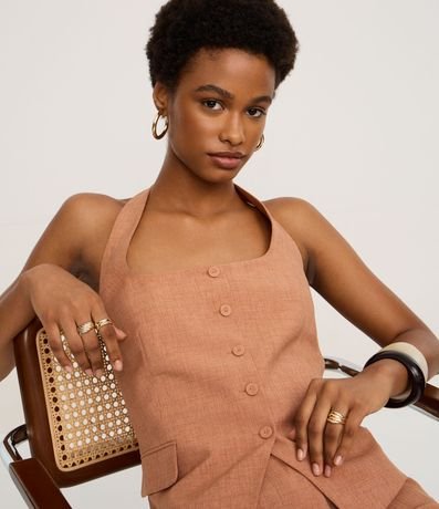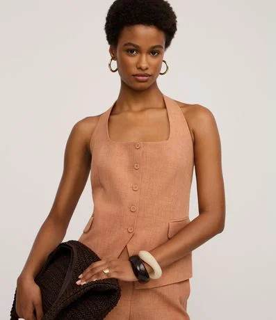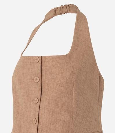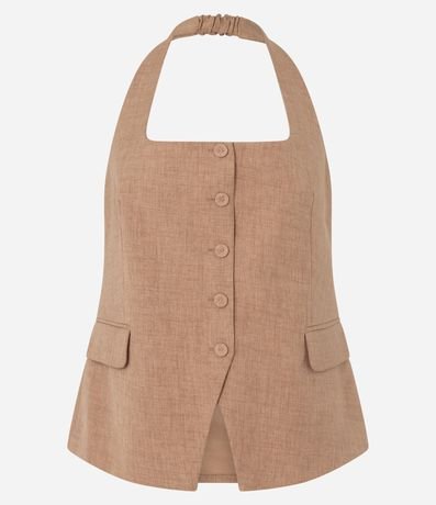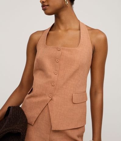 Ref: Colete frente única alfaiatado, confeccionado em tecido plano, com elástico na alça do pescoço, abotoamento frontal e lapelas frontais que simulam bolsos falsos. Este produto foi fabricado através de processos mais sustentáveis, sendo ambientalmente mais responsável.