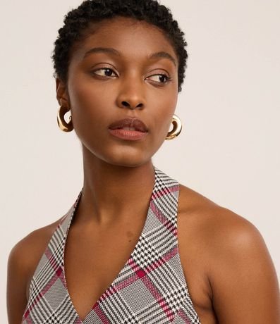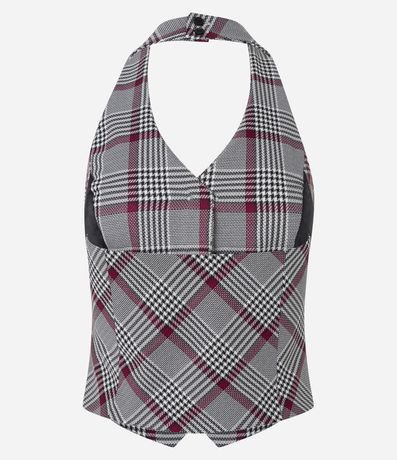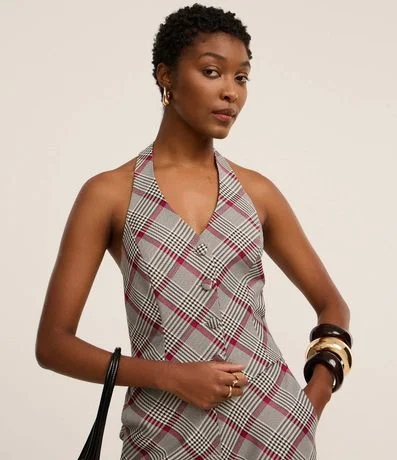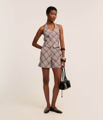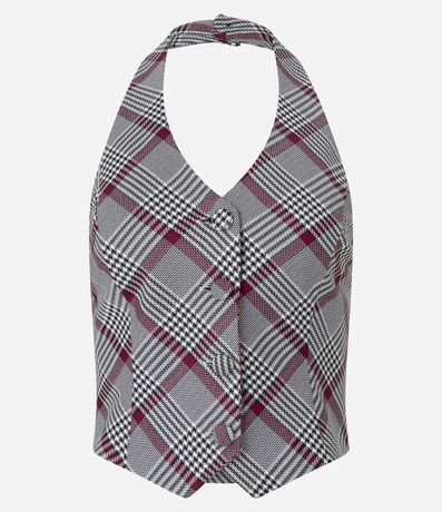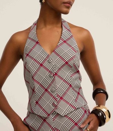 Ref: Colete feminino em alfaiataria com frente única, fechamento no pescoço, abotoamento frontal e estampa xadrez.