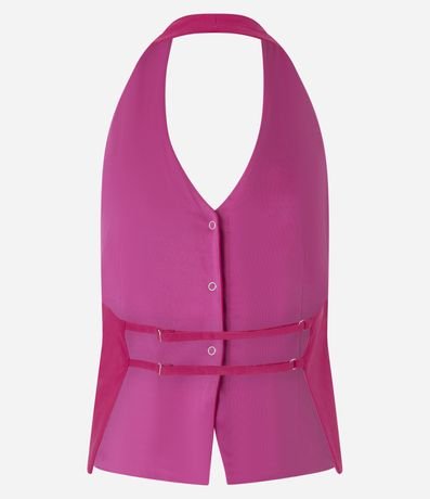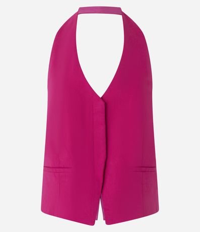 Colete feminino confeccionado em bengaline, com decote V frente única e sem estampa. Possui abotoamento frontal com vista oculta e costas abertas, tendo 02 tirinhas finas com ajustes.