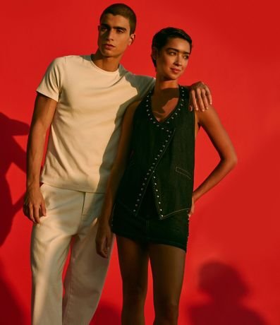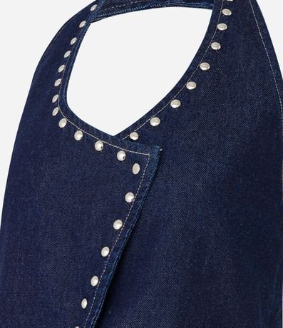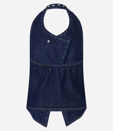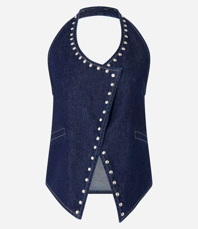 Ref: Colete frente única, confeccionado em jeans, com transpasse assimétrico, bolsos falsos frontais, barra V e tachas aplicadas ao entorno da vista e da gola, Este produto possui algodão certificado BCI em sua composição, sendo ambientalmente mais responsável.
