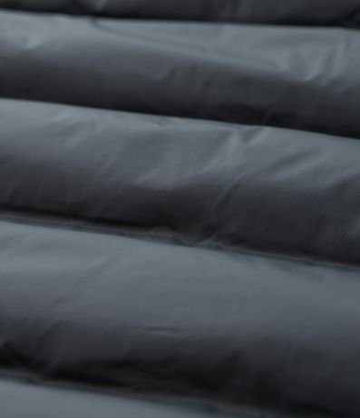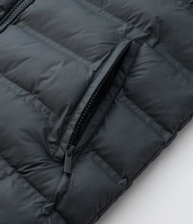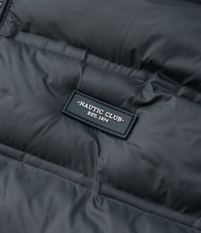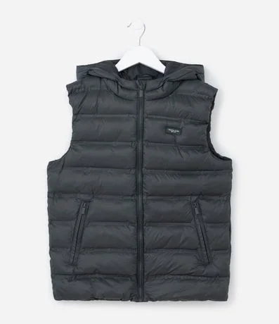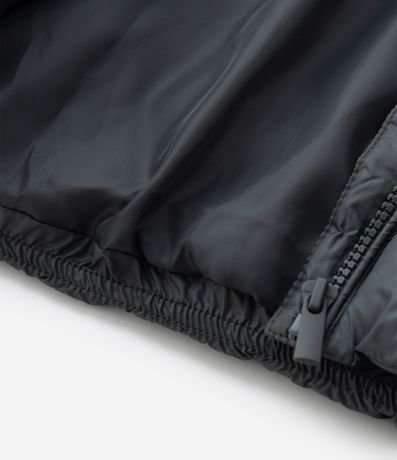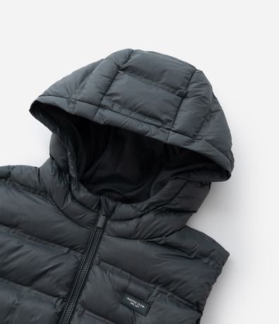 Colete infantil confeccionado em poliamida leve com enchimento acolchoado, garantindo conforto térmico. Possui capuz fixo, fechamento por zíper frontal e bolsos laterais com zíper para praticidade.