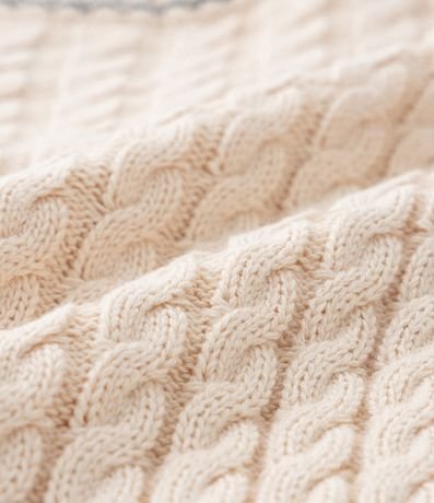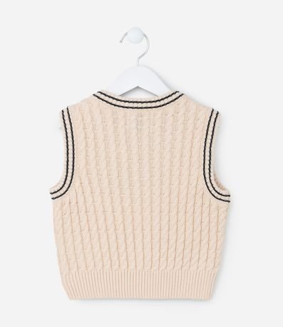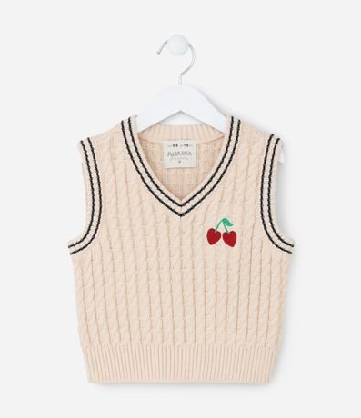 Colete infantil confeccionado em tricô leve, com textura trançada e decote V. Possui acabamento contrastante na gola e cavas, e detalhe de cerejinha bordada no peito.